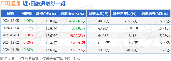 广电运通融资融券信息显示,融资方面,当日融资买入1.22亿元,融资偿还1.87亿元,融资净偿还6517.61万元。融券方面,融券卖出6.56万股,融券偿还21.78万股,融券余量48.68万股,融券余额637.71万元。融资融券余额15.06亿元。