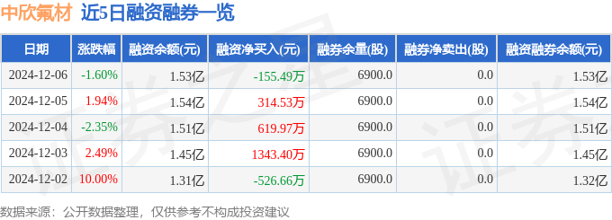 中欣氟材融资融券信息显示,融资方面,当日融资买入2842.72万元,融资偿还2998.21万元,融资净偿还155.49万元。融券方面,融券卖出0.0股,融券偿还0.0股,融券余量6900.0股,融券余额8.91万元。融资融券余额1.53亿元。