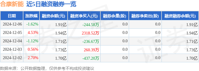 合康新能融资融券信息显示,融资方面,当日融资买入1384.38万元,融资偿还1628.96万元,融资净偿还244.58万元。融券方面,融券卖出0.0股,融券偿还0.0股,融券余量0.0股,融券余额0.0万元。融资融券余额1.91亿元。
