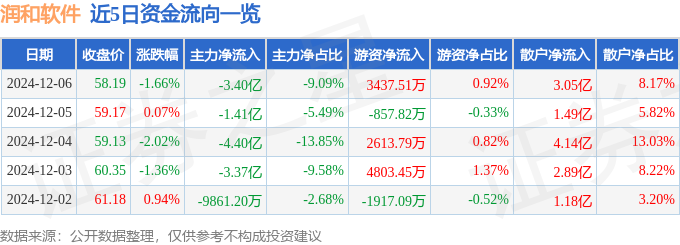 截至2024年12月6日收盘,润和软件(300339)报收于58.19元,下跌1.66%,换手率8.17%,成交量63.51万手,成交额37.36亿元。