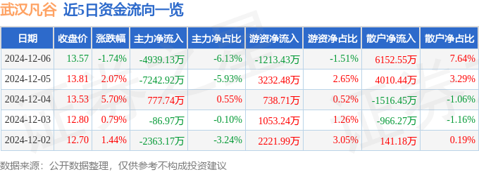 12月6日的资金流向数据方面,主力资金净流出4939.13万元,占总成交额6.13%,游资资金净流出1213.43万元,占总成交额1.51%,散户资金净流入6152.55万元,占总成交额7.64%。