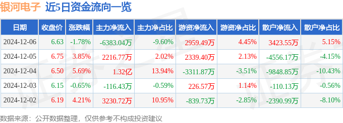 12月6日的资金流向数据方面,主力资金净流出6383.04万元,占总成交额9.6%,游资资金净流入2959.49万元,占总成交额4.45%,散户资金净流入3423.55万元,占总成交额5.15%。