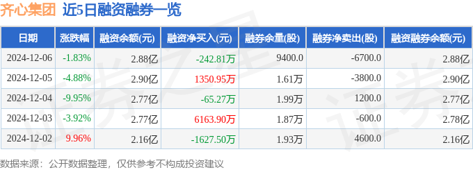 截至2024年12月6日收盘,齐心集团(002301)报收于8.03元,下跌1.83%,换手率9.32%,成交量66.93万手,成交额5.39亿元。