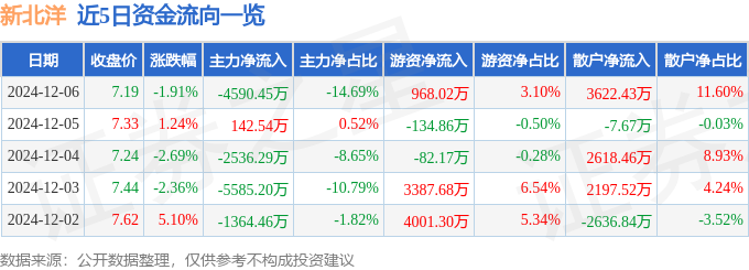 截至2024年12月6日收盘,新北洋(002376)报收于7.19元,下跌1.91%,换手率6.19%,成交量43.25万手,成交额3.12亿元。