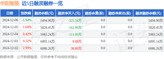 华阳智能融资融券信息显示,融资方面,当日融资买入497.32万元,融资偿还822.86万元,融资净偿还325.54万元。融券方面,融券卖出0.0股,融券偿还0.0股,融券余量0.0股,融券余额0.0万元。融资融券余额5494.9万元。