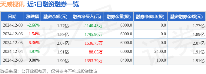 天威视讯融资融券信息显示,融资方面,当日融资买入2243.74万元,融资偿还3384.17万元,融资净偿还1140.43万元。融券方面,融券卖出0.0股,融券偿还0.0股,融券余量6000.0股,融券余额6.15万元。融资融券余额1.77亿元。