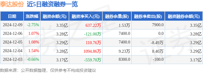 泰达股份融资融券信息显示,融资方面,当日融资买入2197.92万元,融资偿还1560.69万元,融资净买入637.22万元。融券方面,融券卖出7900.0股,融券偿还0.0股,融券余量1.53万股,融券余额7.02万元。融资融券余额3.35亿元。