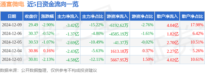截至2024年12月9日收盘,通富微电(002156)报收于29.49元,下跌2.9%,换手率4.99%,成交量75.72万手,成交额22.47亿元。