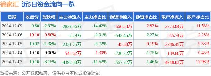12月9日的资金流向数据方面,主力资金净流出2829.36万元,占总成交额14.42%,游资资金净流入556.33万元,占总成交额2.83%,散户资金净流入2273.04万元,占总成交额11.58%。