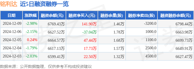 铭利达融资融券信息显示,融资方面,当日融资买入562.25万元,融资偿还420.35万元,融资净买入141.9万元。融券方面,融券卖出100.0股,融券偿还3300.0股,融券余量1.46万股,融券余额29.01万元。融资融券余额6798.44万元。