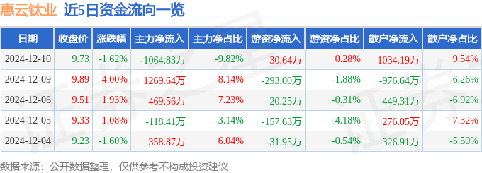 截至2024年12月10日收盘,惠云钛业(300891)报收于9.73元,下跌1.62%,换手率3.31%,成交量10.99万手,成交额1.08亿元。