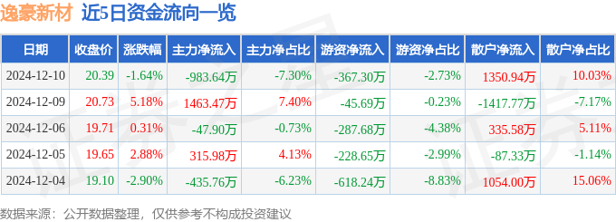 截至2024年12月10日收盘,逸豪新材(301176)报收于20.39元,下跌1.64%,换手率11.53%,成交量6.5万手,成交额1.35亿元。