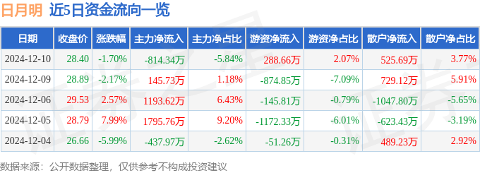 截至2024年12月10日收盘,日月明(300906)报收于28.4元,下跌1.7%,换手率6.79%,成交量4.87万手,成交额1.39亿元。