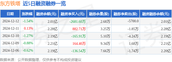 东方铁塔融资融券信息显示,融资方面,当日融资买入1908.08万元,融资偿还4589.68万元,融资净偿还2681.6万元。融券方面,融券卖出0.0股,融券偿还5700.0股,融券余量2.68万股,融券余额20.56万元。融资融券余额2.01亿元。