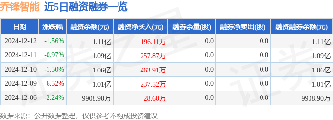 乔锋智能融资融券信息显示,融资方面,当日融资买入1020.85万元,融资偿还824.74万元,融资净买入196.11万元,连续3日净买入累计917.89万元。融券方面,融券卖出0.0股,融券偿还0.0股,融券余量0.0股,融券余额0.0万元。融资融券余额1.11亿元。