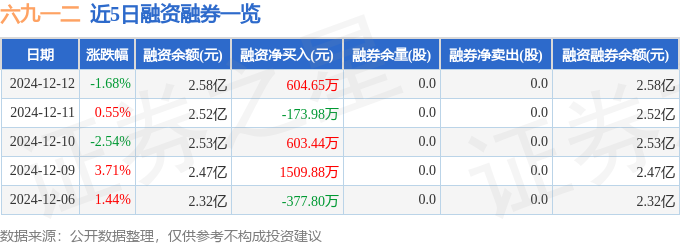 六九一二融资融券信息显示,融资方面,当日融资买入3240.02万元,融资偿还2635.37万元,融资净买入604.65万元。融券方面,融券卖出0.0股,融券偿还0.0股,融券余量0.0股,融券余额0.0万元。融资融券余额2.58亿元。