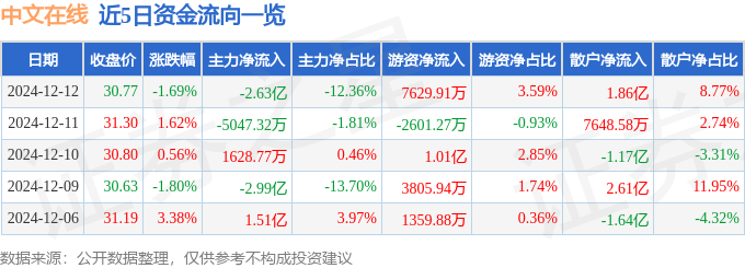 12月12日的资金流向数据方面,主力资金净流出2.63亿元,占总成交额12.36%,游资资金净流入7629.91万元,占总成交额3.59%,散户资金净流入1.86亿元,占总成交额8.77%。