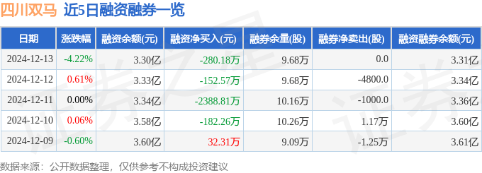 四川双马融资融券信息显示,融资方面,当日融资买入629.82万元,融资偿还909.99万元,融资净偿还280.18万元。融券方面,融券卖出0.0股,融券偿还0.0股,融券余量9.68万股,融券余额153.91万元。融资融券余额3.31亿元。
