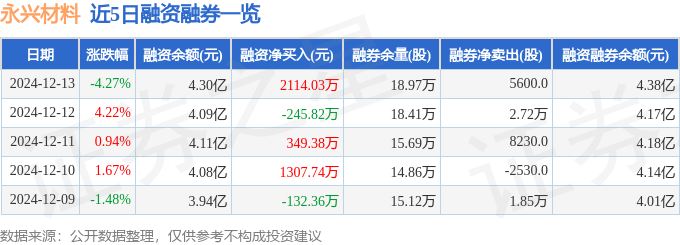 截至2024年12月13日收盘,永兴材料(002756)报收于42.8元,下跌4.27%,换手率2.66%,成交量10.34万手,成交额4.48亿元。