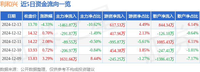 截至2024年12月13日收盘,利和兴(301013)报收于13.7元,下跌4.33%,换手率5.19%,成交量9.83万手,成交额1.38亿元。
