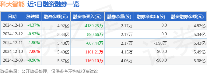 科大智能融资融券信息显示,融资方面,当日融资买入5370.42万元,融资偿还9559.67万元,融资净偿还4189.25万元。融券方面,融券卖出0.0股,融券偿还0.0股,融券余量2.17万股,融券余额26.6万元。融资融券余额4.92亿元。