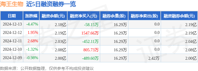 海王生物融资融券信息显示,融资方面,当日融资买入1071.06万元,融资偿还1129.21万元,融资净偿还58.15万元。融券方面,融券卖出0.0股,融券偿还0.0股,融券余量16.29万股,融券余额48.71万元。融资融券余额2.19亿元。
