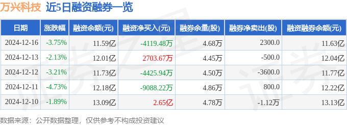万兴科技融资融券信息显示,融资方面,当日融资买入1.76亿元,融资偿还2.18亿元,融资净偿还4119.48万元。融券方面,融券卖出2500.0股,融券偿还200.0股,融券余量4.68万股,融券余额331.44万元。融资融券余额11.63亿元。