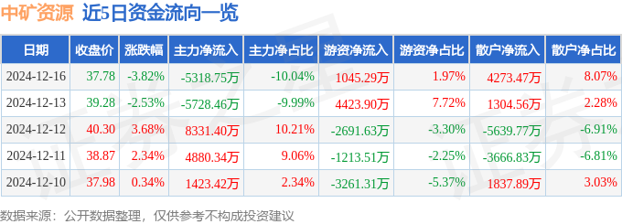 截至2024年12月16日收盘,中矿资源(002738)报收于37.78元,下跌3.82%,换手率1.95%,成交量13.88万手,成交额5.3亿元。