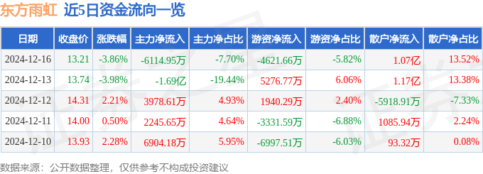 截至2024年12月16日收盘,东方雨虹(002271)报收于13.21元,下跌3.86%,换手率3.08%,成交量59.44万手,成交额7.94亿元。