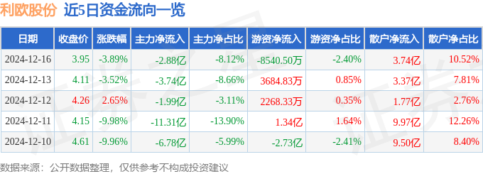 12月16日的资金流向数据方面,主力资金净流出2.88亿元,占总成交额8.12%,游资资金净流出8540.5万元,占总成交额2.4%,散户资金净流入3.74亿元,占总成交额10.52%。