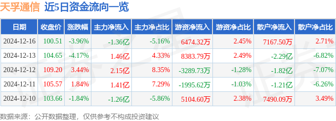 12月16日的资金流向数据方面,主力资金净流出1.36亿元,占总成交额5.16%,游资资金净流入6474.32万元,占总成交额2.45%,散户资金净流入7167.5万元,占总成交额2.71%。