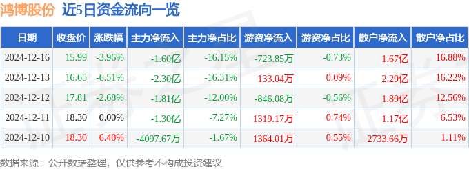 截至2024年12月16日收盘,鸿博股份(002229)报收于15.99元,下跌3.96%,换手率12.36%,成交量60.96万手,成交额9.92亿元。