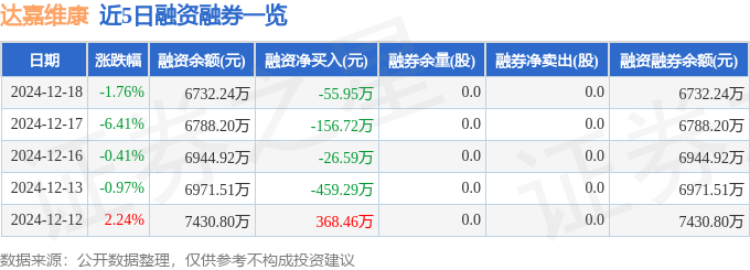 达嘉维康融资融券信息显示,融资方面,当日融资买入506.7万元,融资偿还562.66万元,融资净偿还55.95万元。融券方面,融券卖出0.0股,融券偿还0.0股,融券余量0.0股,融券余额0.0万元。融资融券余额6732.24万元。