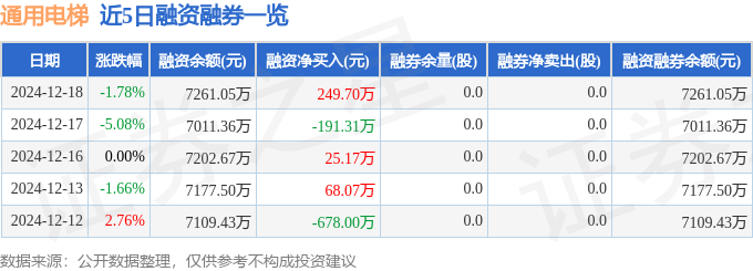 通用电梯融资融券信息显示,融资方面,当日融资买入495.48万元,融资偿还245.78万元,融资净买入249.7万元。融券方面,融券卖出0.0股,融券偿还0.0股,融券余量0.0股,融券余额0.0万元。融资融券余额7261.05万元。