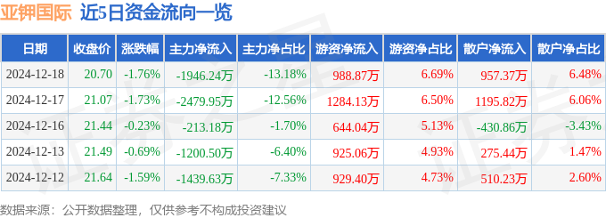 截至2024年12月18日收盘,亚钾国际(000893)报收于20.7元,下跌1.76%,换手率0.88%,成交量7.11万手,成交额1.48亿元。