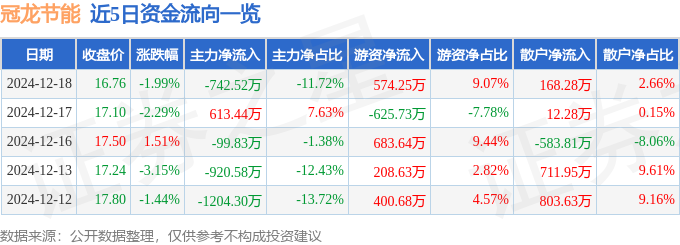 截至2024年12月18日收盘,冠龙节能(301151)报收于16.76元,下跌1.99%,换手率6.74%,成交量3.77万手,成交额6334.48万元。