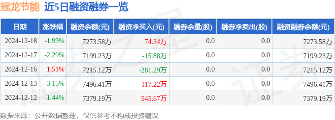 冠龙节能融资融券信息显示,融资方面,当日融资买入504.13万元,融资偿还429.79万元,融资净买入74.34万元。融券方面,融券卖出0.0股,融券偿还0.0股,融券余量0.0股,融券余额0.0万元。融资融券余额7273.58万元。