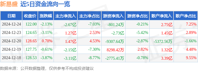 截至2024年12月24日收盘,新易盛(300502)报收于122.0元,下跌2.13%,换手率4.99%,成交量31.45万手,成交额37.96亿元。