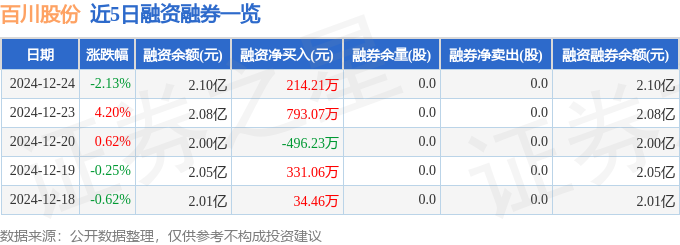 百川股份融资融券信息显示,融资方面,当日融资买入1576.43万元,融资偿还1362.23万元,融资净买入214.21万元。融券方面,融券卖出0.0股,融券偿还0.0股,融券余量0.0股,融券余额0.0万元。融资融券余额2.1亿元。