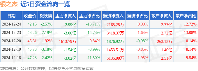 12月24日的资金流向数据方面,主力资金净流出2.99亿元,占总成交额13.71%,游资资金净流入2165.25万元,占总成交额0.99%,散户资金净流入2.77亿元,占总成交额12.72%。