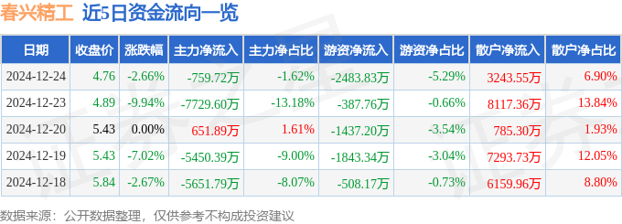 截至2024年12月24日收盘,春兴精工(002547)报收于4.76元,下跌2.66%,换手率8.99%,成交量99.3万手,成交额4.7亿元。
