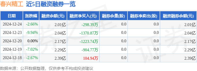 春兴精工融资融券信息显示,融资方面,当日融资买入1673.62万元,融资偿还1972.01万元,融资净偿还298.39万元。融券方面,融券卖出0.0股,融券偿还0.0股,融券余量0.0股,融券余额0.0万元。融资融券余额2.01亿元。