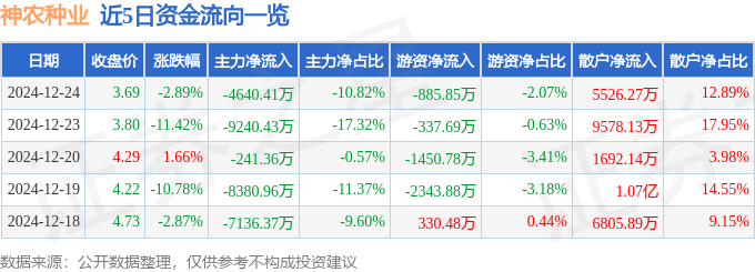 截至2024年12月24日收盘,神农种业(300189)报收于3.69元,下跌2.89%,换手率13.28%,成交量117.68万手,成交额4.29亿元。