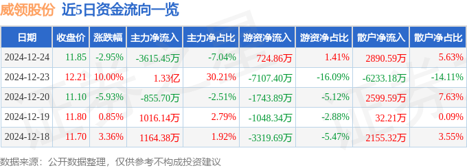 12月24日的资金流向数据方面,主力资金净流出3615.45万元,占总成交额7.04%,游资资金净流入724.86万元,占总成交额1.41%,散户资金净流入2890.59万元,占总成交额5.63%。