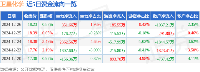 截至2024年12月26日收盘,卫星化学(002648)报收于18.23元,下跌0.87%,换手率0.72%,成交量24.23万手,成交额4.41亿元。