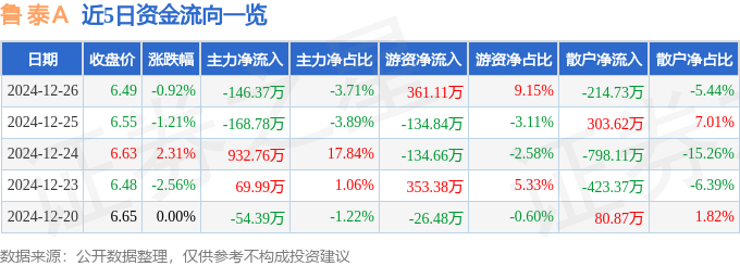 截至2024年12月26日收盘,鲁 泰A(000726)报收于6.49元,下跌0.92%,换手率1.03%,成交量6.05万手,成交额3947.96万元。