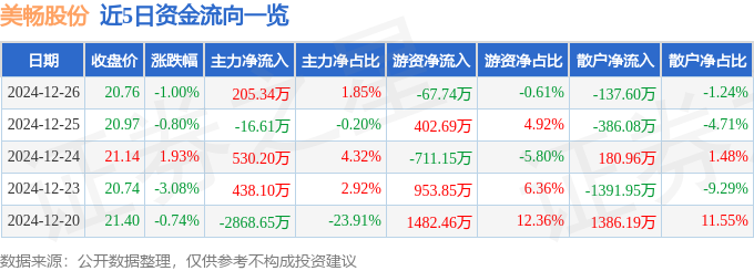 截至2024年12月26日收盘,美畅股份(300861)报收于20.76元,下跌1.0%,换手率1.76%,成交量5.31万手,成交额1.11亿元。