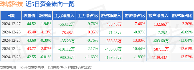 12月27日的资金流向数据方面,主力资金净流出563.12万元,占总成交额9.76%,游资资金净流入430.46万元,占总成交额7.46%,散户资金净流入132.66万元,占总成交额2.3%。