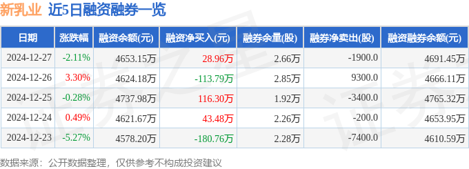 新乳业融资融券信息显示,融资方面,当日融资买入919.81万元,融资偿还890.85万元,融资净买入28.96万元。融券方面,融券卖出100.0股,融券偿还2000.0股,融券余量2.66万股,融券余额38.3万元。融资融券余额4691.45万元。
