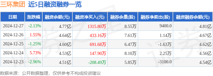 三环集团融资融券信息显示,融资方面,当日融资买入3850.84万元,融资偿还2535.05万元,融资净买入1315.8万元,连续3日净买入累计2440.64万元。融券方面,融券卖出2.49万股,融券偿还1.55万股,融券余量8.55万股,融券余额334.31万元。融资融券余额4.81亿元。
